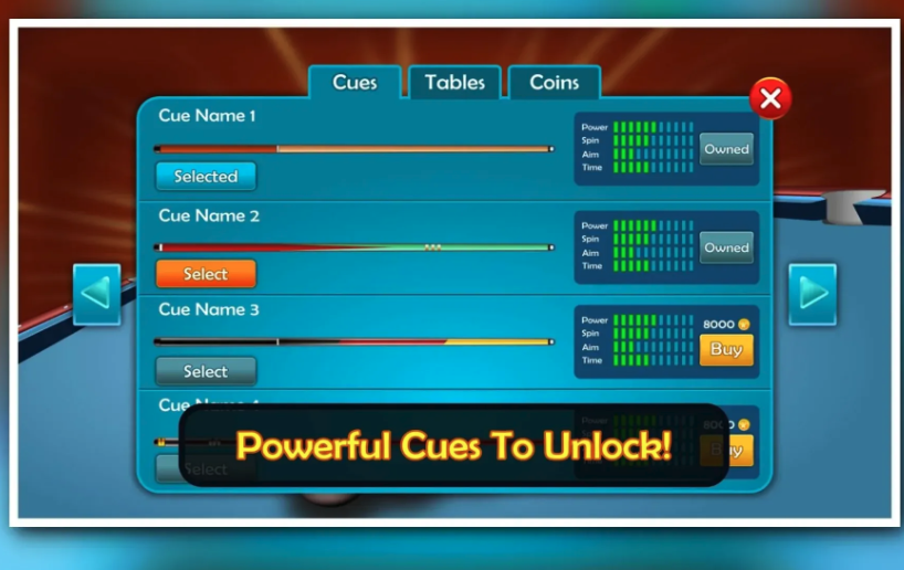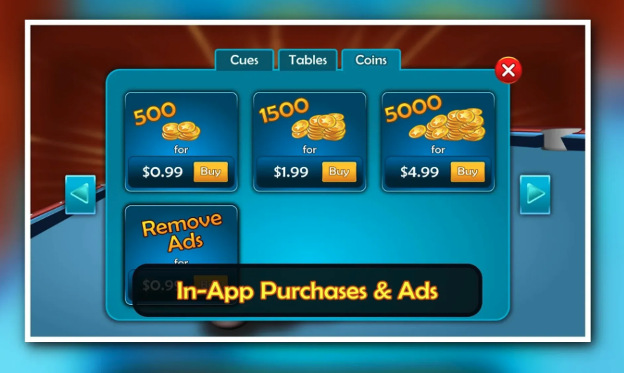 In-app purchases for cues, tables, and game currency