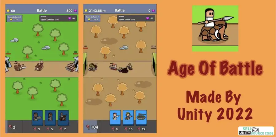 With simple yet engaging gameplay mechanics, players collect resources, manage food supplies, produce and upgrade their troops, and evolve through multiple ages — from the Stone Age to modern warfare. The Age Of Battle template from SellUnitySourceCode.com is lightweight, easy to reskin, and ideal for both new and experienced Unity developers looking to build mobile strategy games that perform flawlessly on Android and iOS.
