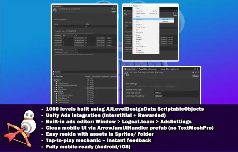 Monetization-ready with a built-in ads editor (Window > Logcat.team > AdsSettings) for easy setup and control.