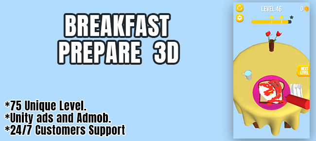 Developed using Unity, this complete project is easy to set up and customize. You can change graphics, integrate your own ads, and publish directly to Google Play or the App Store. Whether you’re a new developer or an experienced Unity creator, Breakfast Prepare 3D is a ready-to-launch project built for success.