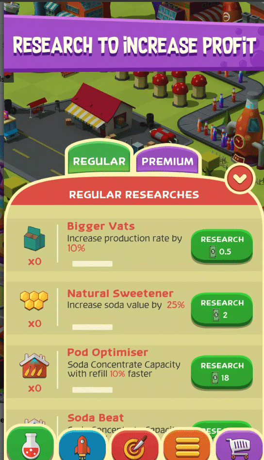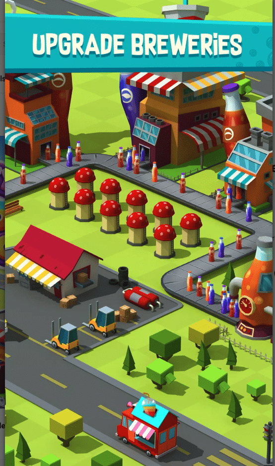 Core Systems: Soda production, trucks delivery automation, idle earnings, income multipliers, factory upgrades