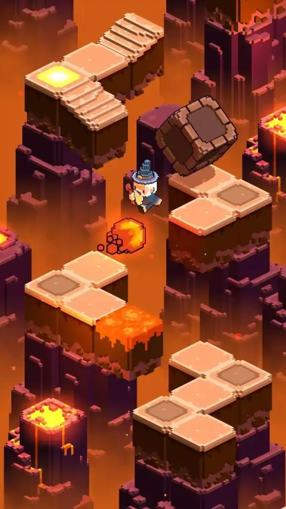 The gameplay is easy to learn but challenging to master, featuring tap-to-turn, tap-to-jump, and double-tap-to-double-jump controls inspired by classic temple-style runners. Players must carefully navigate blocky traps, collapsing paths, and endless pits while progressing through a variety of vibrant locations, including tombs, snowy landscapes, volcanoes, and pyramids.