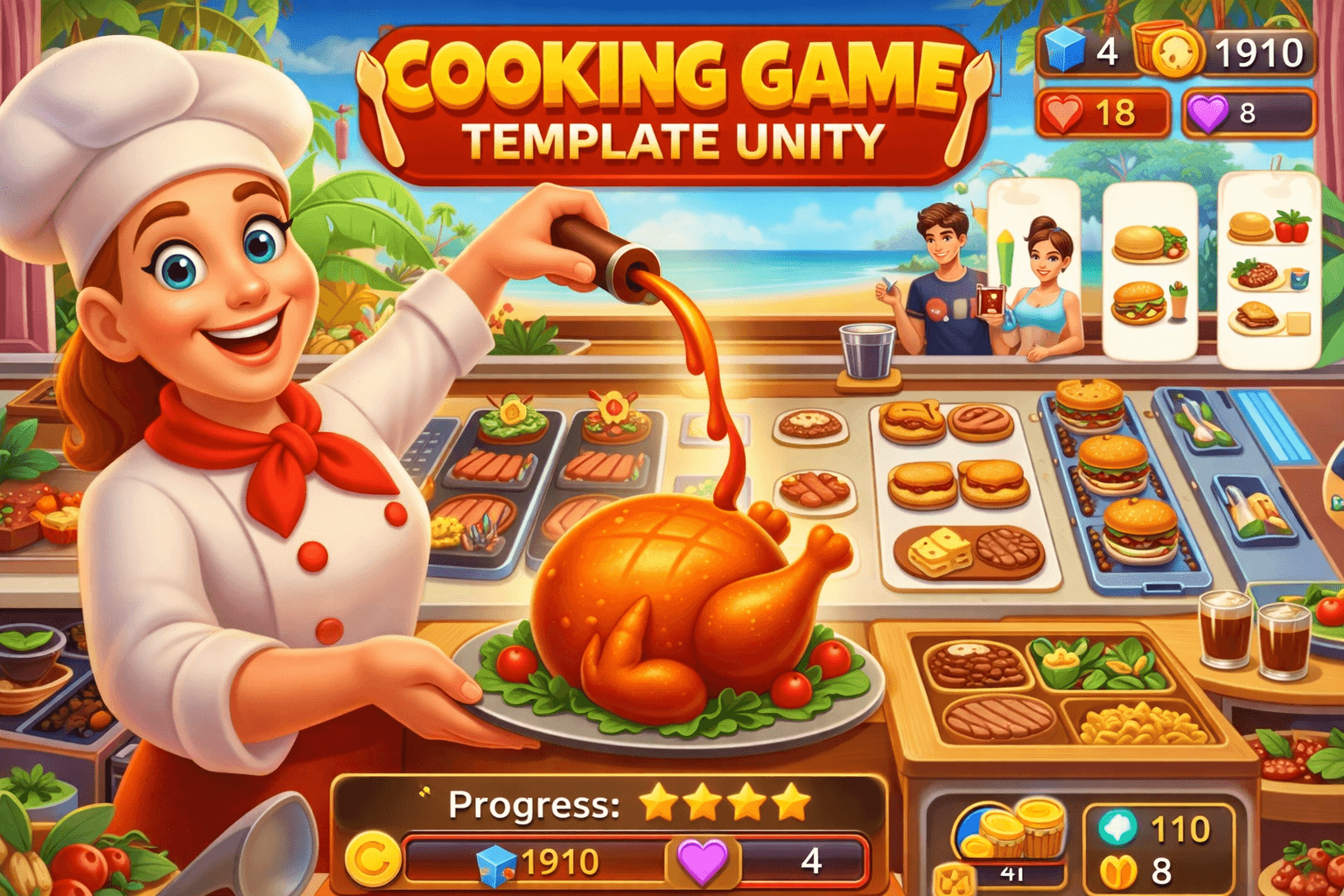 Players will cook, serve, and manage orders under pressure while upgrading kitchen equipment, unlocking new dishes, and completing challenging levels. With smooth controls, polished UI, and a scalable system, this template gives you a solid foundation to launch your own restaurant cooking game quickly.