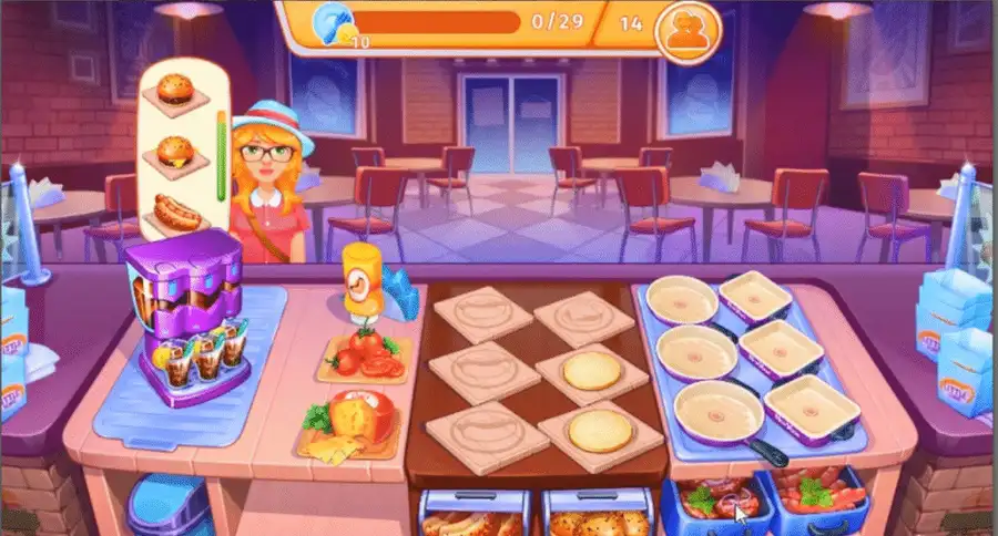 Players prepare food orders using intuitive drag-and-drop mechanics, managing burger stations, drinks, sausages, and side ingredients while serving customers as efficiently as possible. The game includes a colorful cartoon-style UI, smooth animations, and responsive interactions that create an engaging and satisfying cooking experience.