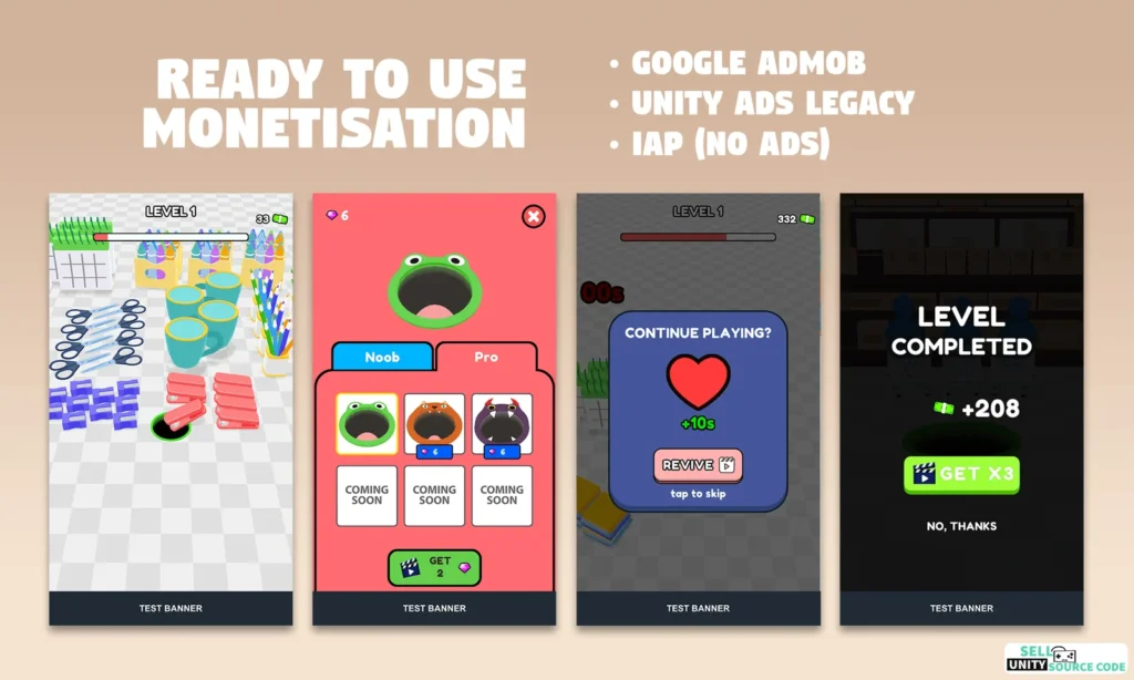 This template comes fully packed with monetization features, including AdMob, Unity Ads, and IAP options—giving you a complete revenue-ready game from day one.