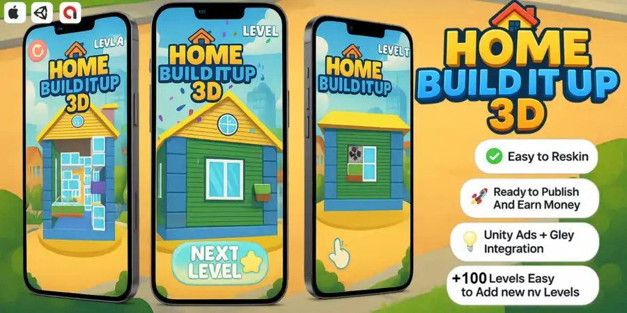 Home Build It Up 3D is a complete Unity 3D Hyper-Casual Puzzle game designed for fast deployment on the Google Play Store (Android) and the Apple App Store (iOS). The project features a clean structure, ready-to-use systems, and robust monetization support, making it ideal for developers who want to publish quickly without sacrificing quality.