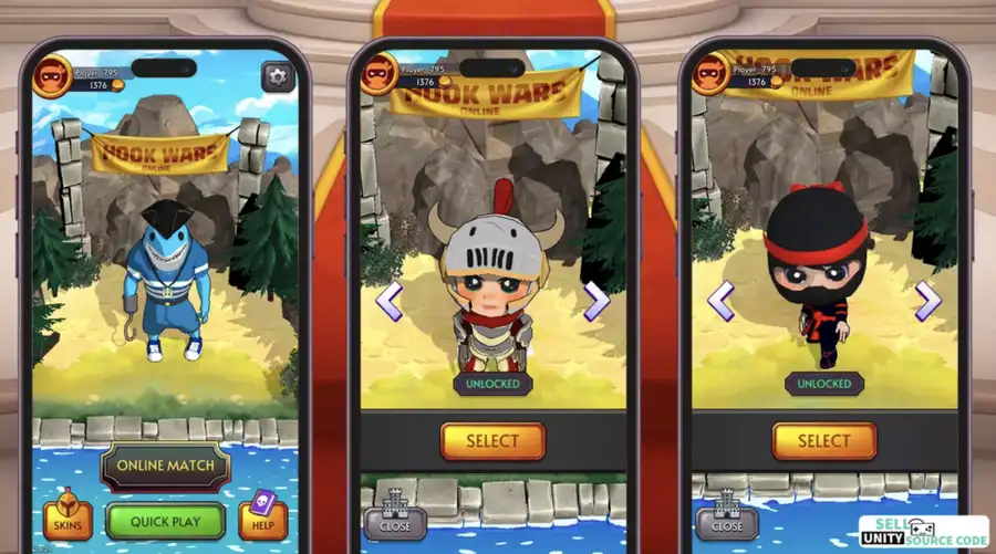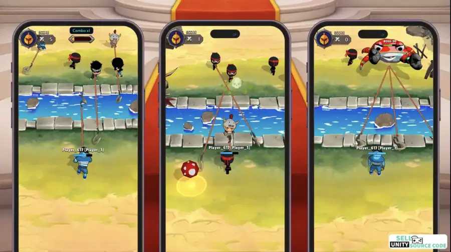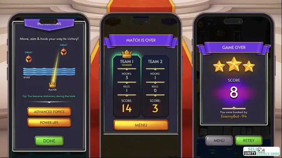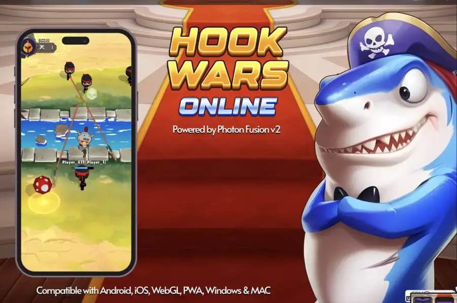 Hook Wars Online Multiplayer is a powerful and feature-packed Unity MOBA-style action game template built with Photon Fusion v2, giving you a complete real-time online multiplayer experience that works smoothly on all platforms. Battle players worldwide, hook enemies across the river, unlock heroes, use tactical power-ups, and dominate the arena with fast-paced PVP combat.