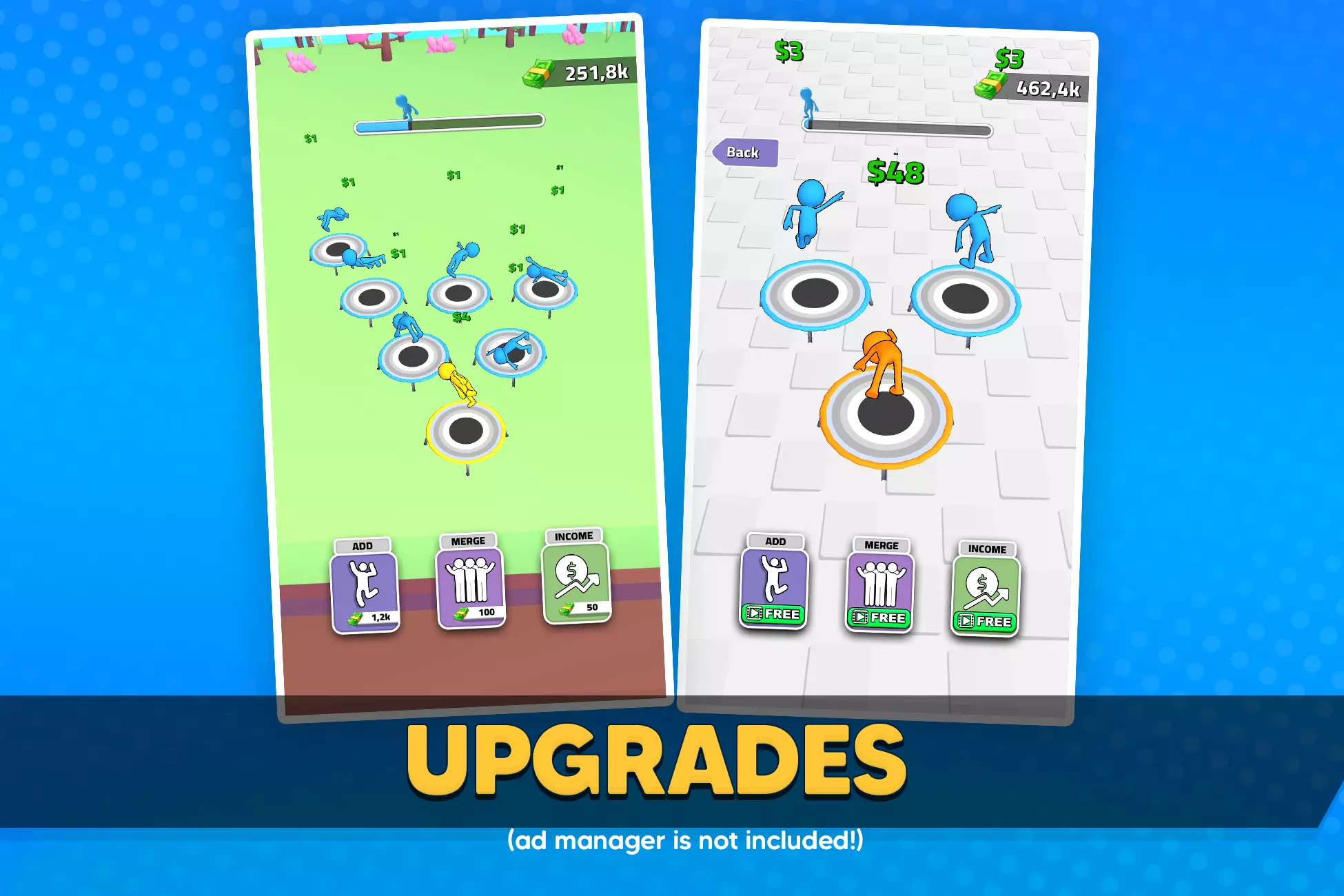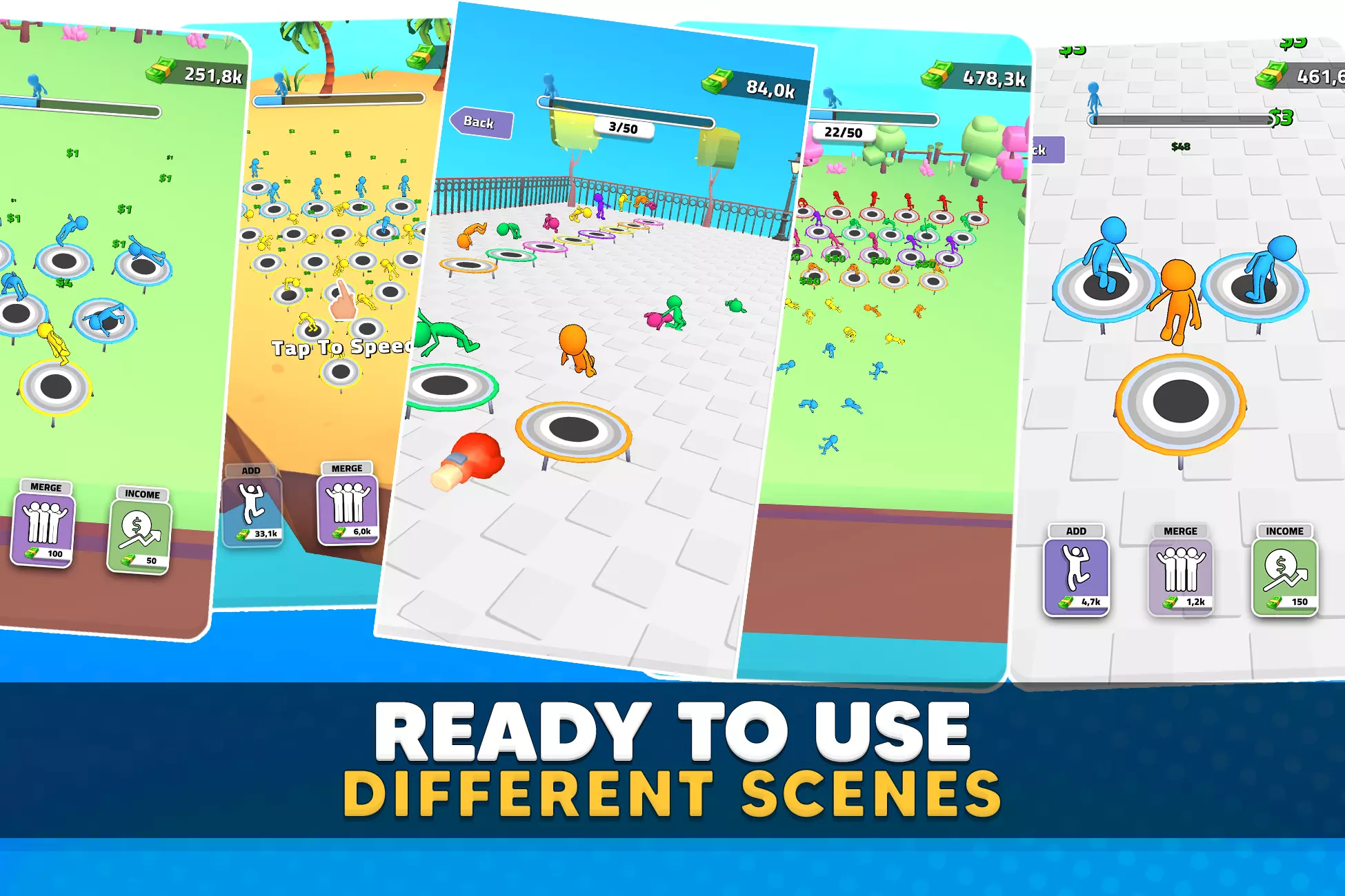 ✅ Add your own characters, maps, trampolines, skins, currencies, UI, and monetization—then release your next addictive idle hit!