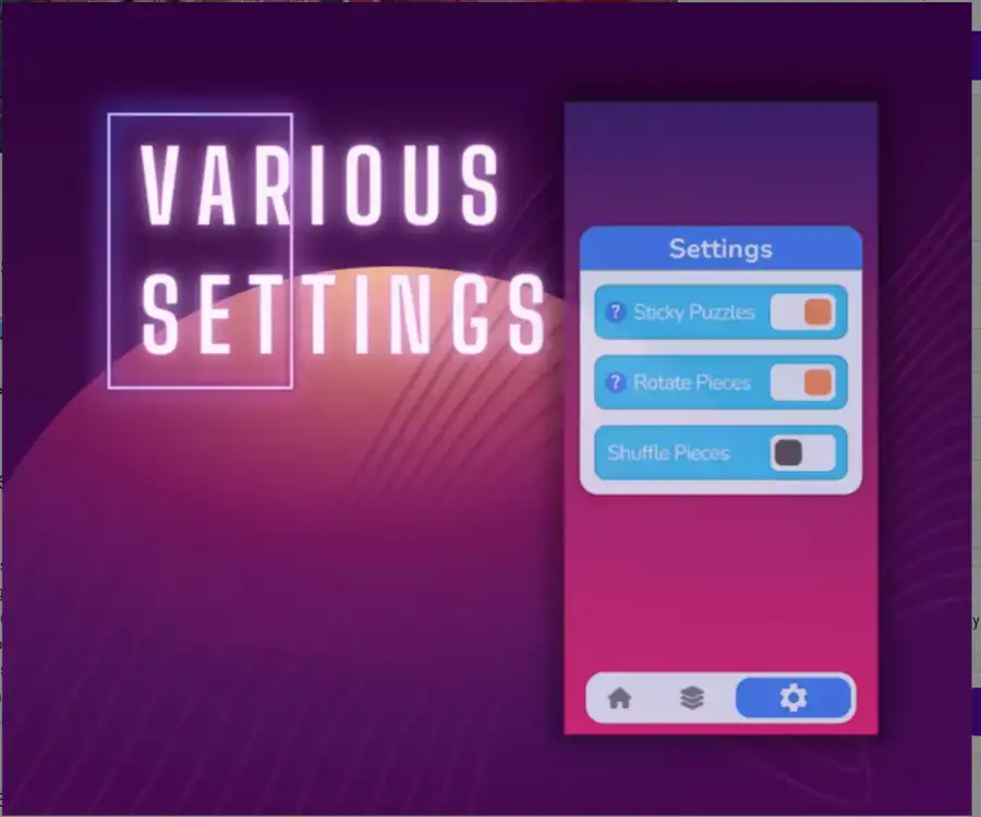 The system supports puzzle sizes ranging from simple 2×2 grids to complex 100×100 layouts. Developers can customize puzzle piece shapes, organize puzzles into categories, and enable optional rotation for added challenge. A robust save and load system allows players to pause and resume puzzles at any time without losing progress.