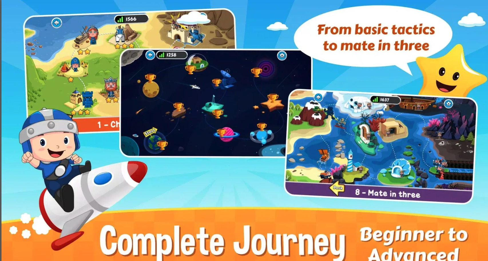 Players travel across three beautifully themed maps — the Kingdom, Sea World, and Space Adventure — where each level introduces chess concepts through fun missions and creative gameplay. From beginner lessons to full chess matches, the game adapts to different skill levels, making learning both easy and exciting.