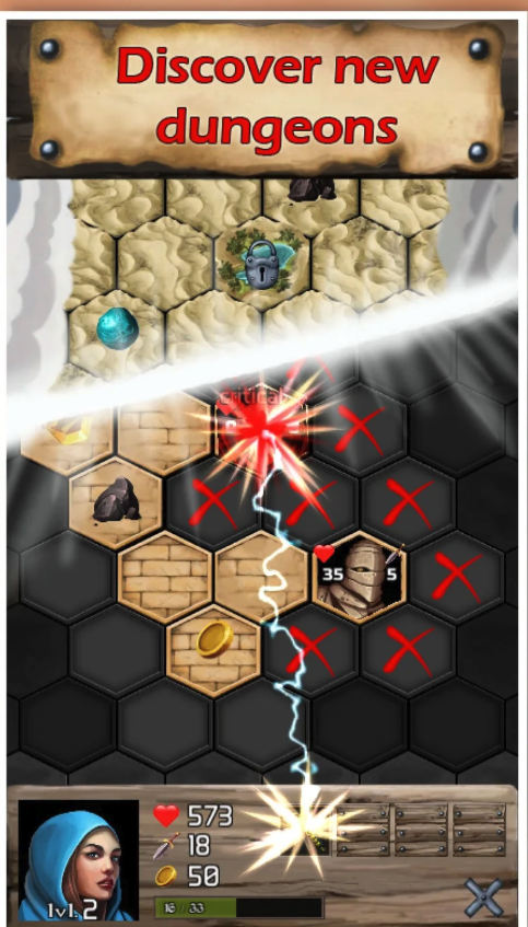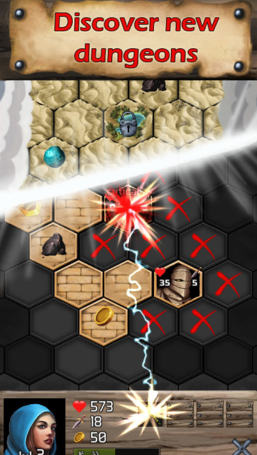 • Dungeon crawling gameplay with monsters, chests, and hidden treasure