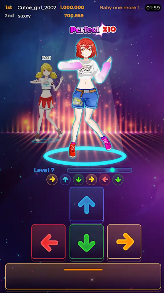 Designed with a clean flat-style UI, Love Dance – Music Party delivers smooth visuals and an enjoyable rhythm flow. The colorful arrows and dynamic music help players relax while still feeling the thrill of a challenging dance battle. The game is more demanding than it first appears, offering satisfying gameplay for casual and skilled players alike.
