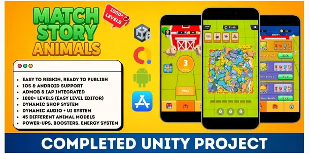 Match Story: Animals – Match 3D Puzzle is a complete, ready-to-publish 3D matching puzzle game built with the latest Unity engine. Players match cute and colorful 3D animal objects in a relaxing yet addictive puzzle experience designed for high retention and casual gameplay success.