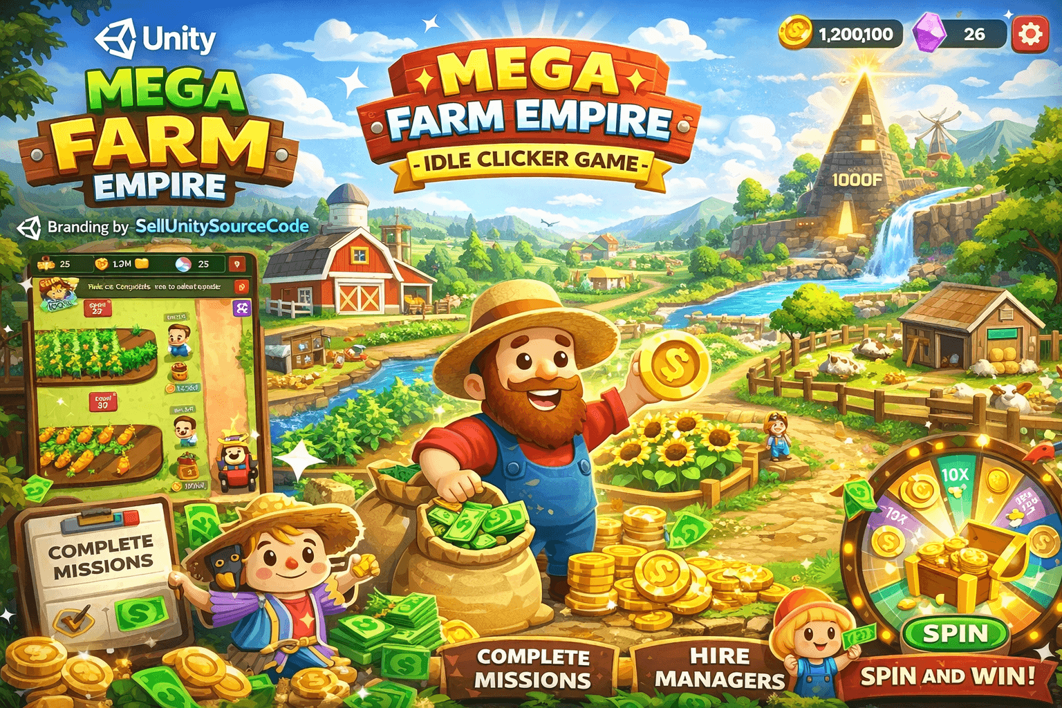 Mega Farm Empire is a relaxing and addictive idle clicker farming tycoon game template created with Unity, designed for players who want a peaceful escape from daily stress. Start with a small piece of land and transform it into a massive agricultural business by growing crops, expanding farms, and automating production.