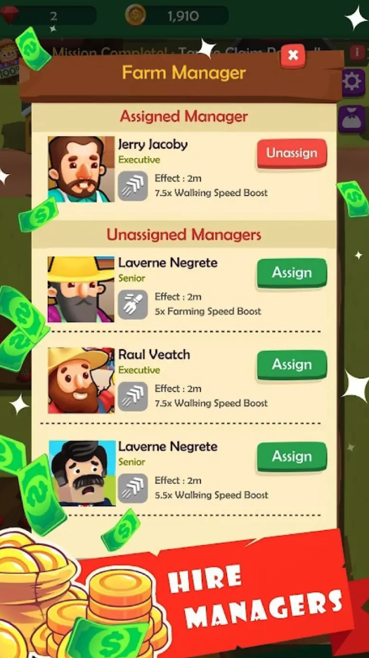 To build a true farm tycoon experience, Mega Farm Empire includes automation systems where players can hire farm managers, workers, and tractor drivers. These helpers boost productivity and allow the farm to generate money even when the player is away. This creates an addictive idle progression system with constant upgrades and long-term goals.