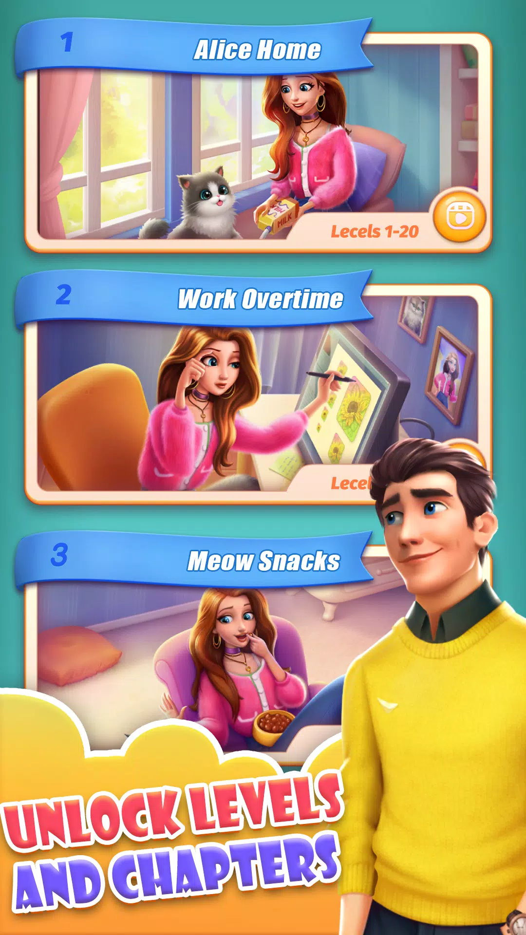 You can experience exciting match-3 levels to push the plot in daily life. See how Alice and naughty Chris deal with every trifling matter every day. What kind of sparks will Chris and Brother be expected to create?