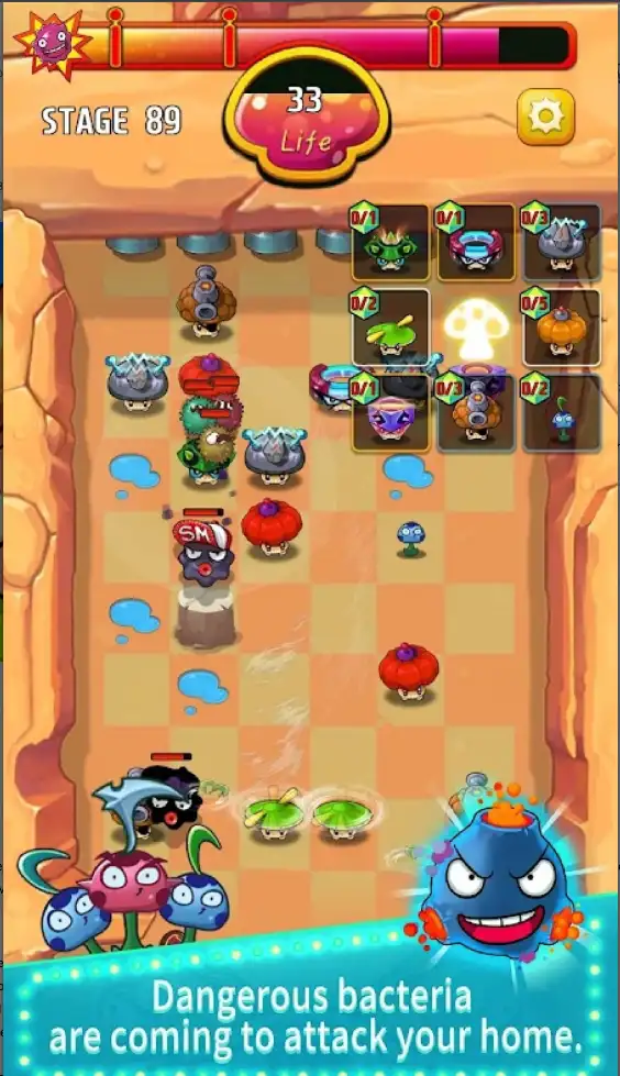 Players deploy and upgrade mushroom units that evolve visually as they grow stronger, creating a satisfying sense of progression. With over 100 challenging stages, the game introduces a variety of bacteria types, each featuring unique attributes that require different tactical approaches to defeat.