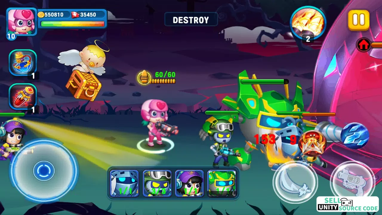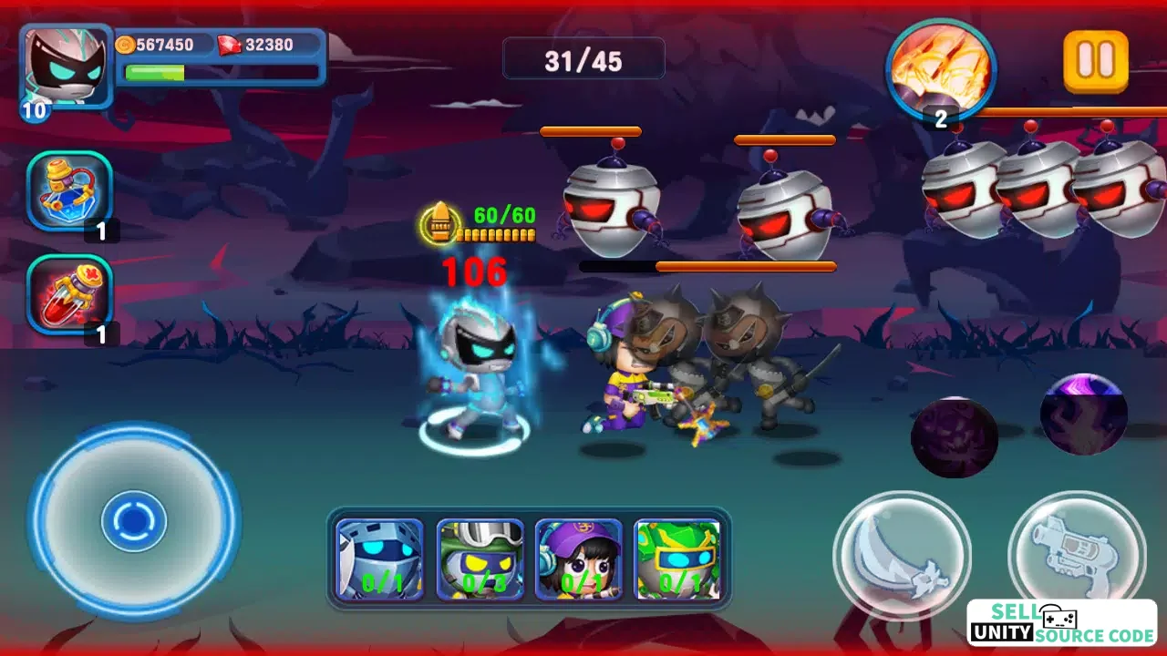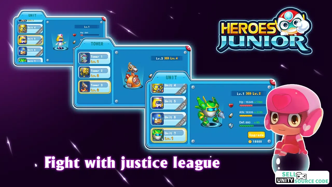 Superheroes Junior is a side-scrolling action RPG where you transform into powerful superheroes, battle robot monsters, unlock weapons, recruit allies, and fight through 90+ levels including epic boss stages. Full Unity 2022 source code available on SellUnitySourceCode.com.