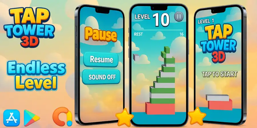 Tap Tower 3D is a fully developed 3D casual endless stacking game built with Unity, designed for quick publishing on Google Play (Android), Apple App Store (iOS), and WebGL.