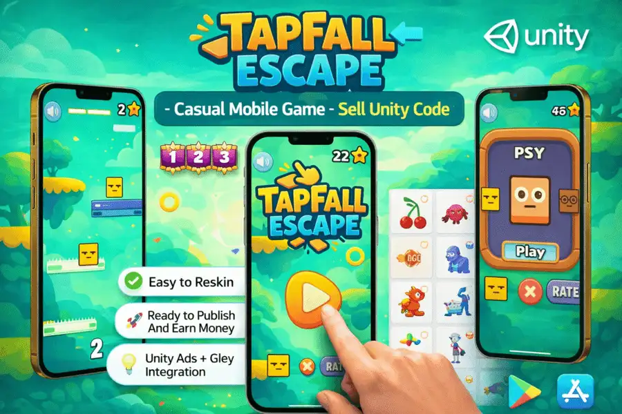 TapFall Escape is a fully developed casual 2D game built as a complete Unity project, optimized for fast publishing on both the Google Play Store and the Apple App Store. Designed with simplicity and flexibility in mind, the project allows developers to easily customize UI elements, text, fonts, sounds, and visuals without complex setup.