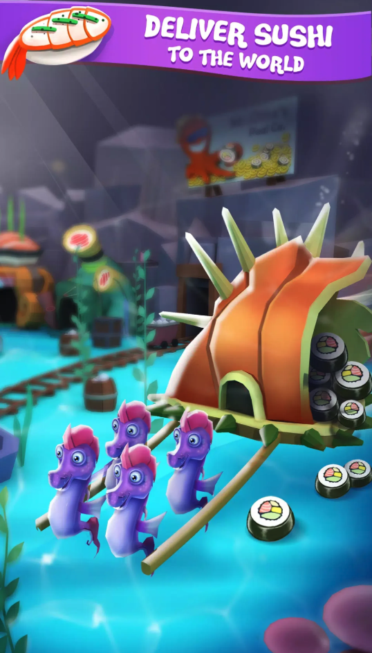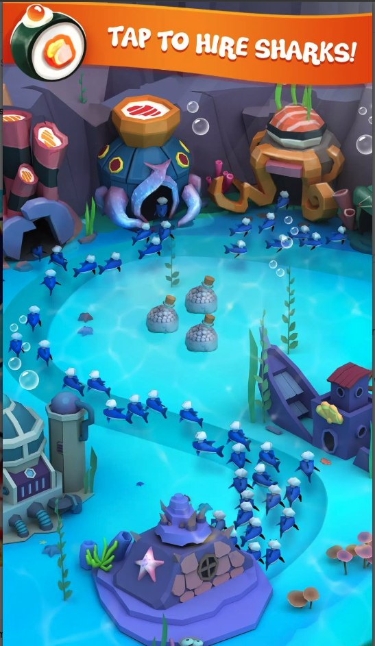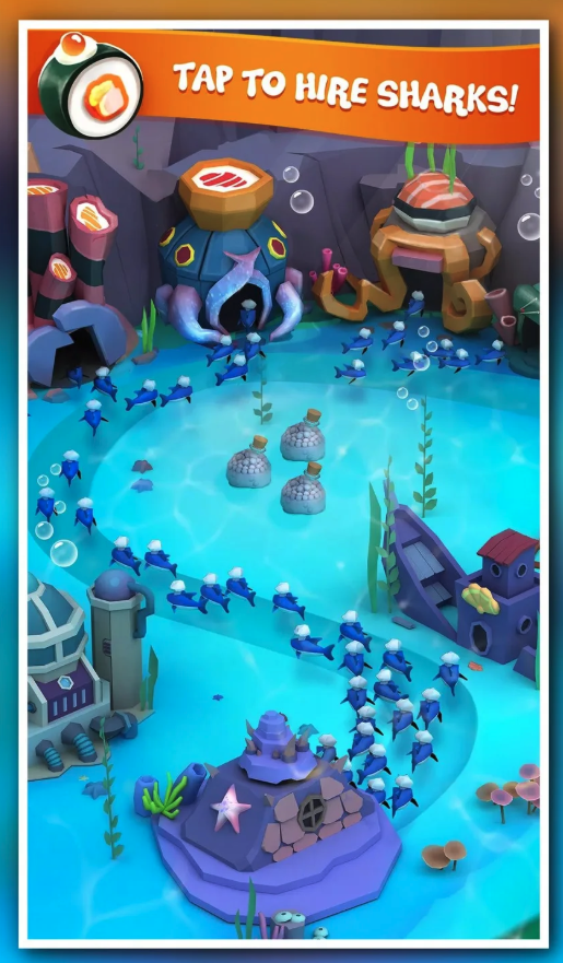 Players begin with a small sushi setup under the sea, then rapidly expand production by tapping to generate baby sharks and collect sushi rewards. As income grows, they can upgrade shark production hubs, expand sushi centers, and optimize the empire for maximum profit. The core gameplay loop is designed for retention: tap → earn → upgrade → automate → expand.