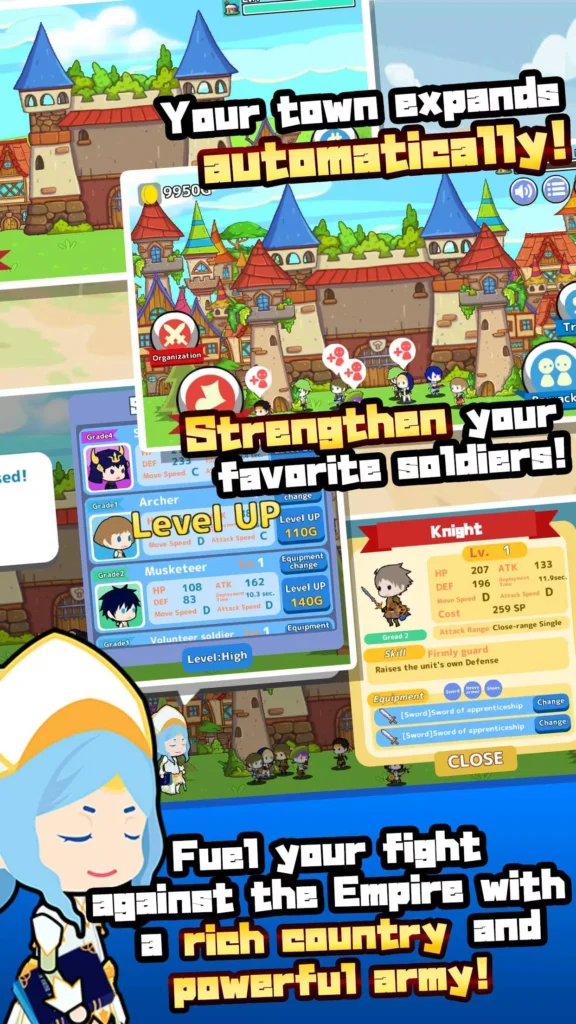 Lead the tiny kingdom of Freedia as you push back the invading Darks Empire. Train troops, expand your town, summon reinforcements, and build a powerful army — all while enjoying charming characters and smooth gameplay.