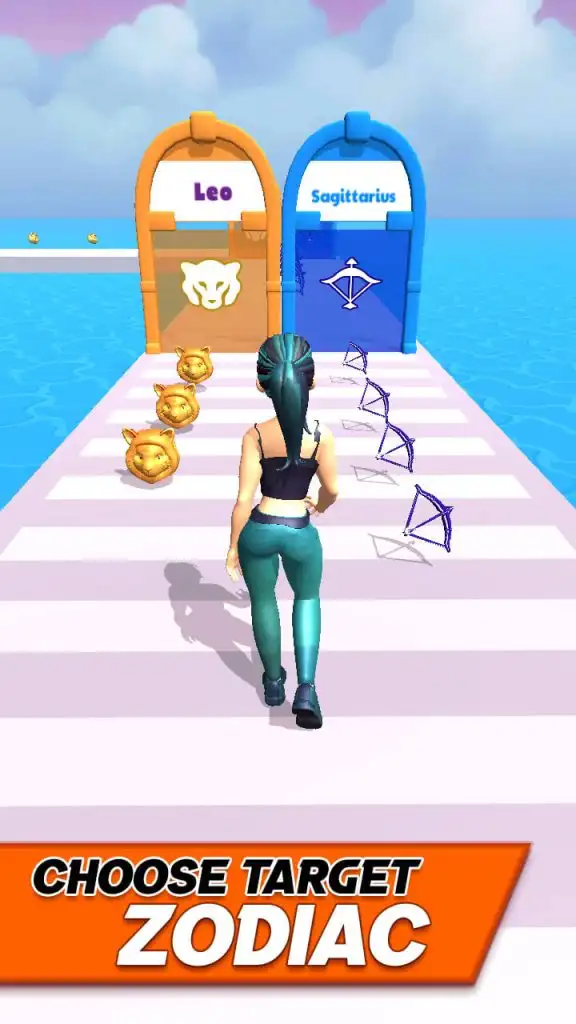 is a fresh and exciting hyper-casual game inspired by astrology, horoscope signs, and personality compatibility. Run through dynamic 3D tracks, collect your matching zodiac energies, avoid opposite signs, and boost your cosmic score to reach the final compatibility challenge!
